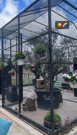Un grand enclos extérieur de 40m2 et de 3m95 de haut a été fabriqué sur mesure pour eux. L'enclos est muni d'abris aménagés pourvus en eau et électricité. Ce "catio" peut être entièrement ouvert ou séparé en deux par une cloison pour séparer les mâles des femelles.